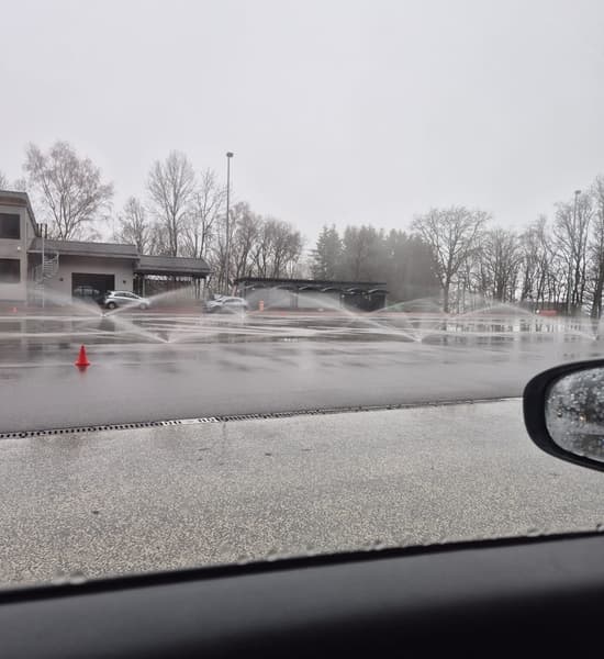 Danach folgten Gefahrenbremsungen: zuerst auf griffigem, dann auf gemischtem Untergrund, um das Verhalten des Autos bei rutschigen Bedingungen kennenzulernen. Im Kreisel übten wir, wie man Untersteuern erkennt und korrigiert.