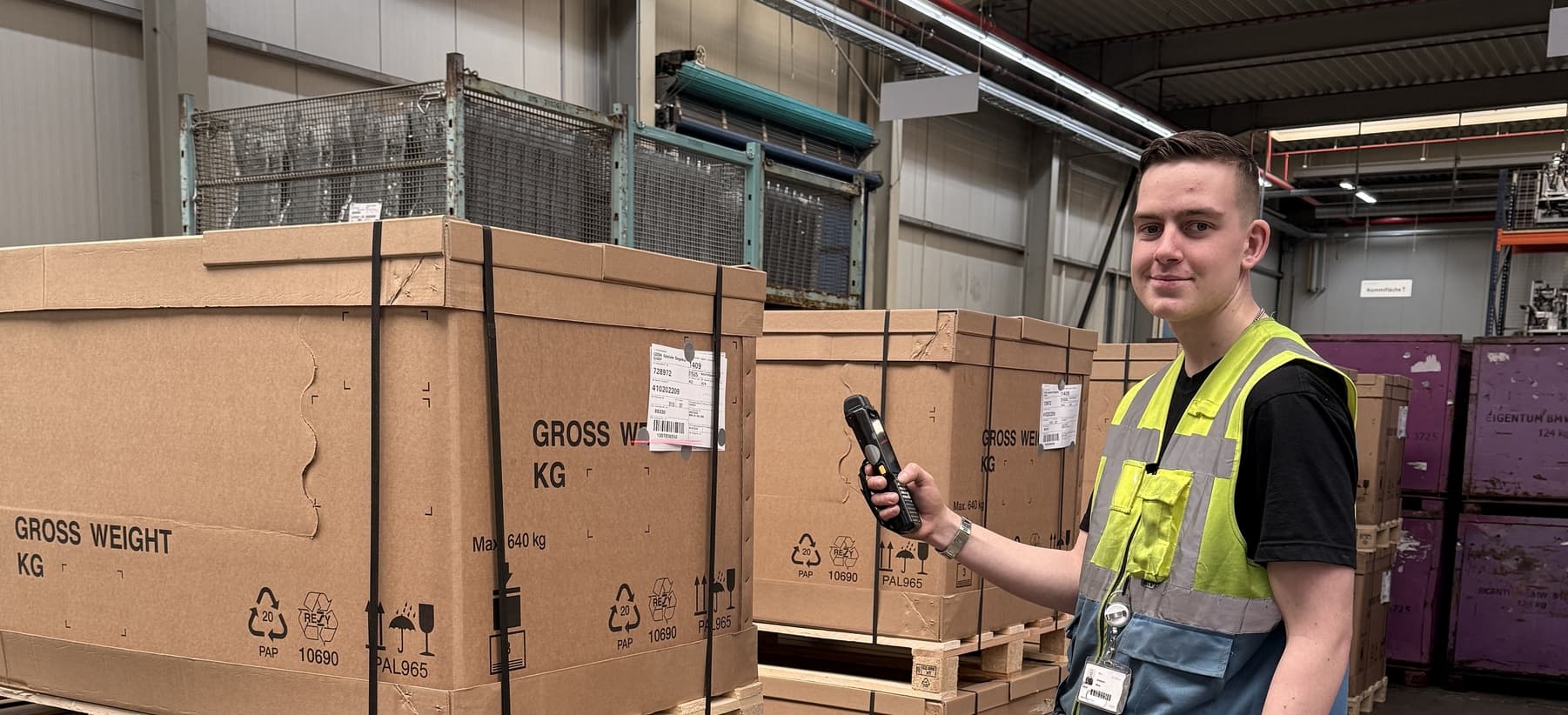 Meine hauptsächlichen Aufgaben sind zum Beispiel, dass ich Ware an die gewünschte Kommissionier Fläche bestelle oder ich etikettiere Waren und scanne dann diese Etiketten. Ich ziehe die Waren zu und stapele sie dann, damit die Ware schön geordnet zum Abliefern bereit steht.