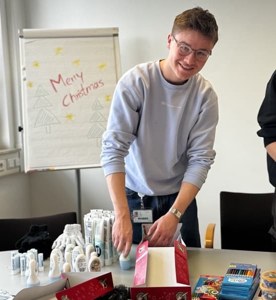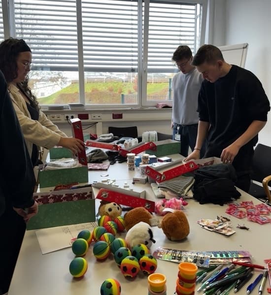 Im Anschluss wurden alle Artikel sortiert und übersichtlich ausgelegt. Danach haben wir die Schuhkartons aufgebaut und nach einer zuvor erstellten Packliste befüllt, die sich am Alter und Geschlecht der Kinder orientierte. Zusätzlich legten wir weihnachtliche Grüße und selbstgestaltete Bilder bei. Schließlich wurden die Kartons von einer Kirchengemeinde abgeholt und zur offiziellen Abgabestelle gebracht.